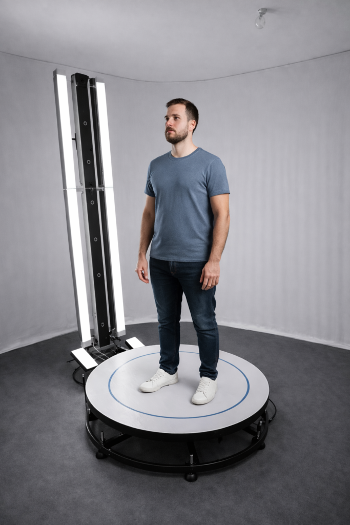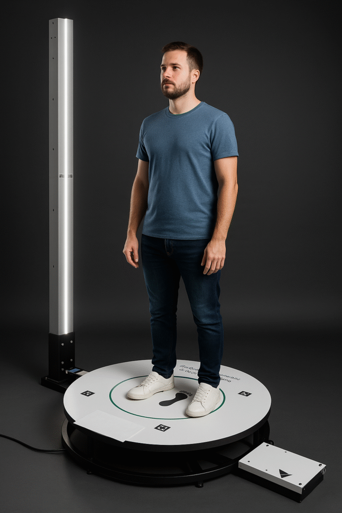 Unser hochmoderner 3D-Ganzkörperscanner erstellt vor Ort in nur wenigen Sekunden ein vollständiges, detailgetreues Abbild deiner Körperform – präzise, schnell und vollkommen kontaktlos.